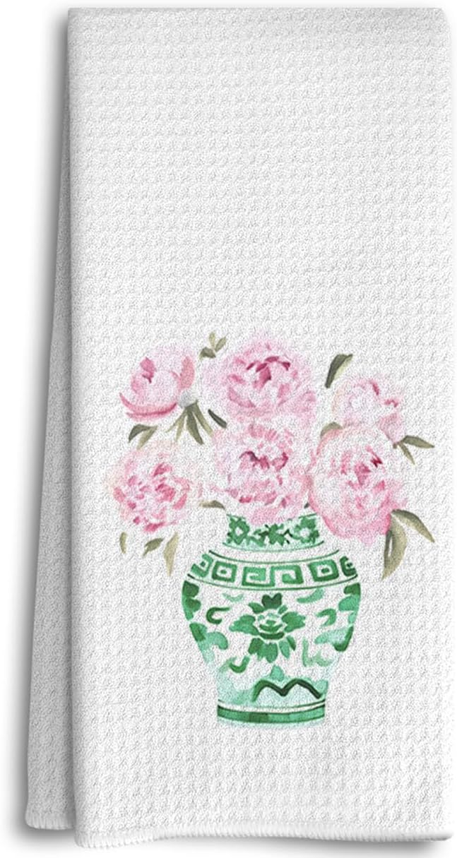 Green Porcelain Kitchen Towels, Chinoiserie Decor, Preppy Hand Towels, Watercolor Pink Floral Chinese Vase Chinoiserie Bathroom Kitchen Decor, Vintage Plant Dish Tea Towels for Kitchen